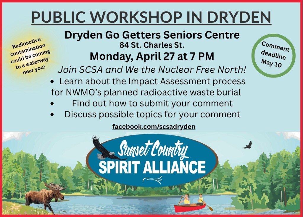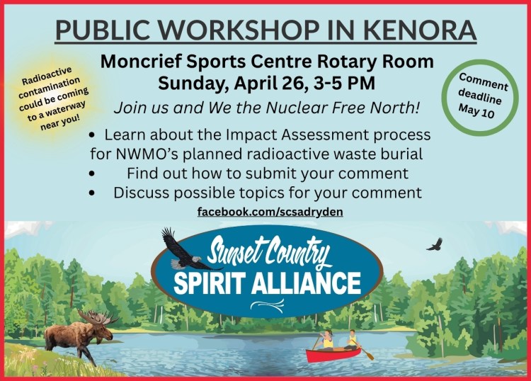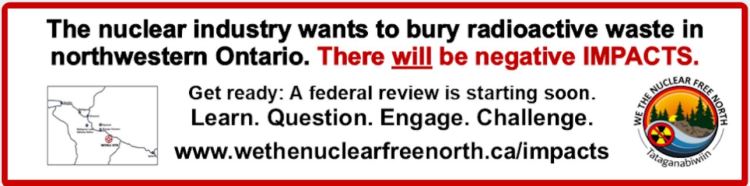 Spread the word about these “disposal” plans. Speak to your elected representatives. Write your local paper. Make a donation to our efforts. Oppose the NWMO loudly. Contact We the Nuclear Free North – we’ll work together.