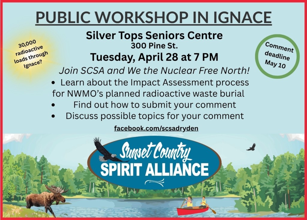 Canada’s nuclear industry makes up the members of the Nuclear Waste Management Organization (NWMO). The NWMO has chosen a location is just south of the TransCanada Highway, between Ignace and Dryden in NW Ontario, to bury an abandon all of Canada’s nuclear fuel waste. If the plan proceeds, an estimated 100,000 tonnes of highly radioactive nuclear fuel waste would be shipped to the selected site, repackaged, buried, and abandoned by 2188. Learn more about the nuclear waste abandonment issue.