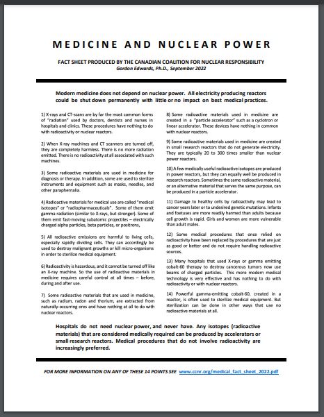 Medicine and Nuclear Power – a Sept. 2022 factsheet by Dr. Gordon Edwards of the Canadian Council for Nuclear Responsibility.